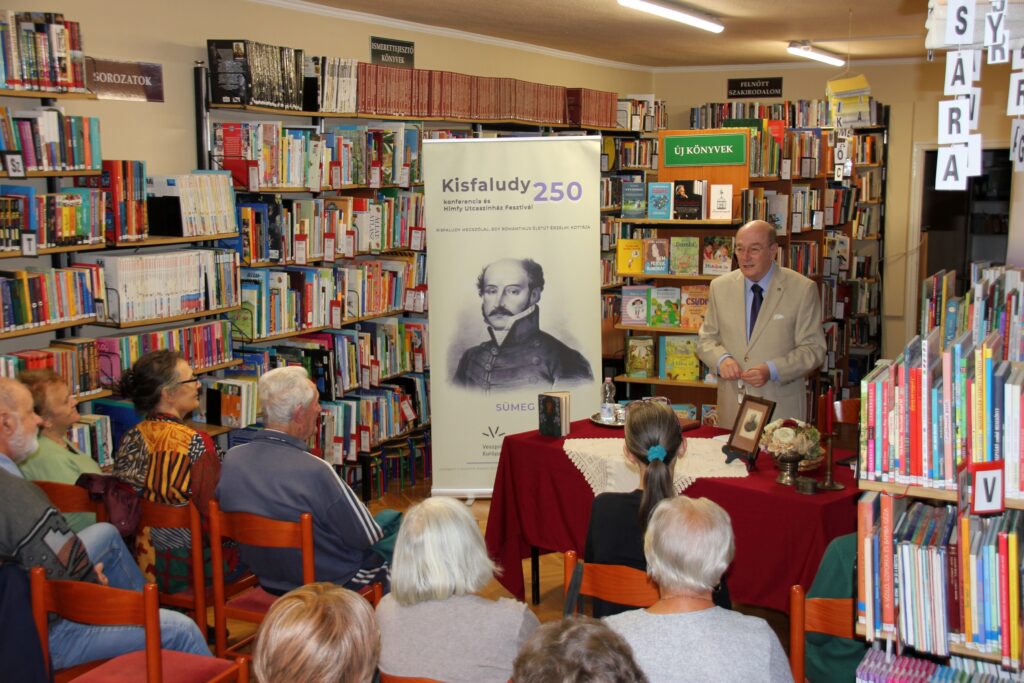 A szervezők, házigazdák nevében Kulcsárné Nagy Ágnes könyvtáros köszöntötte a szép számú közönséget, majd Cséby Géza által Kisfaludy Sándor került a figyelem középpontjába. Mint elhangzott, a költő 1772. szeptember 27-én született Sümegen. Nemesi család sarjaként az akkori szokásoknak megfelelően katonai, vagy ügyvédi pályát választhatott, az irodalom, a költészet nem igazán szerepelt a lehetőségek között, főleg, hogy édesapja ügyvédet szeretett volna faragni belőle. Ennek ellenére katonatiszti karriert épített, szolgált a császári hadsereg tisztjeként Bécsben, majd Milánót védve részt vett a Napóleon elleni háborúban. 1796 júniusában a milánói Sforza-vár ostrománál hadifogságba esett és Franciaországba került, Draguignanba szállították. Itt töltött napjait, megismerkedését Julie-Caroline d’Esclaponnal Francia fogságom című naplójában írta meg. A művelt lánynak köszönhette, hogy Francesco Petrarca és a francia líra hatása alatt verselni kezdett. Fogolycserével szabadult, és ismét szolgálatba állt, de Württembergben teljesített katonaideje leteltével leszerelt a hadseregből.